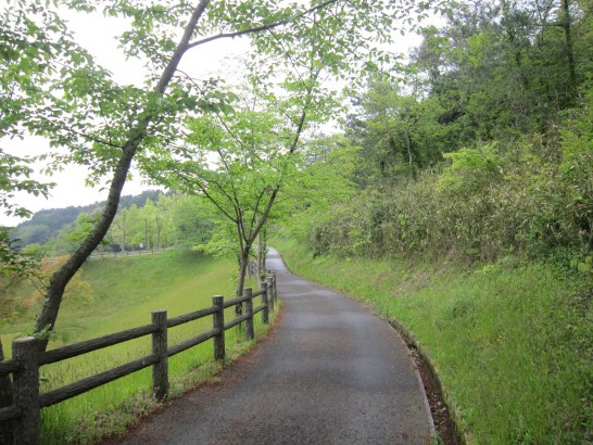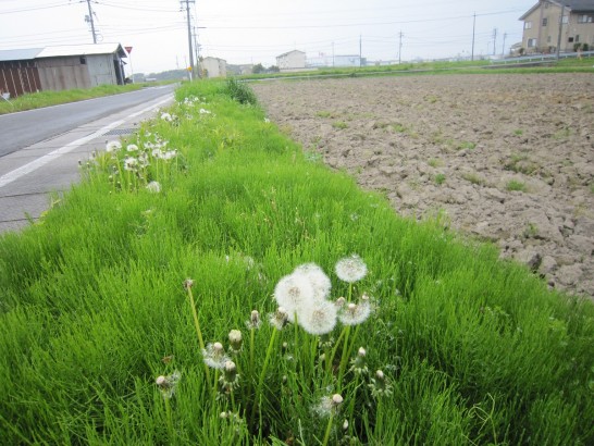 写真:①本日昼前の総合公園遊歩道。葉桜が小雨に濡れて緑が目に沁みた。 ②タンポポの綿毛が「飛びたいけど、雨だね~」と思案していた。右は田起こしの済んだ田圃。
