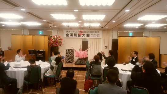 「番傘の大会ではだいたい1句か、せいぜい2句」というマイ・セオリー?通り、今回もこの1句だけ。終了後PM5時より懇親会。参加者アバウト120名? 豊来家大治朗さんの大神楽(写真下)を楽しんだあと待ち兼ねた「カンパ~イ!」。ビールで乾杯後は清酒熱燗&焼酎湯割り、ビールを注ぎに来ていただいたらビール。清酒なら清酒てなことで三種混合ガンガン。カラオケは2番目に指名されて森中恵美子さんと「貝殻節」。応援して下さった皆さんサンキューベリマッチでした! ちょいと飲み過ぎて、地下鉄弁天町からの谷町九丁目への乗り換え駅が分からず、懇親会でも同じ席だった楓楽さん・たもつさん・昌紀さんと電車でも同じで「谷町四丁目で乗り換え!」と教えてもらって、ようやくホテル・アゥイーナ着。チェックインしてバタンキュー。(スマホの写真を削除しようとしたら、写真下の讃岐うどんが出てきた。アウィーナに帰る前に食べたらしい。長いのはアナゴの天麩羅)