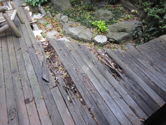 昨年の秋頃から「腐っている濡れ縁を修理して欲しい」と家内から言われていた。誰かが踏み抜いてはいけないので、目立つように、私が踏んで壊したしたのが写真上。「みっともないから早くして!」と言われ続けていたが、忙しくて半年以上放置。ようやく「この連休にやっつけてしまうか…」という気分になった。明日から2日ほどは晴天のようなので、ホームセンターで板を購入して腐食防止ペイントだけ塗って準備完了。明朝から取り掛かる予定。写真①着工前。②4日の昼前までの作業終了。材料不足につき午後より購入予定。
