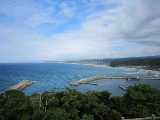 写真 ①帰路、「魚見台」に寄って絶景をパチリ。右下は釣り場としても有名な「船磯港・ふないそこう」。②同じ「魚見台」の東側断崖。頭の上から南の方は雲に覆われていたが、海上には青空があった。