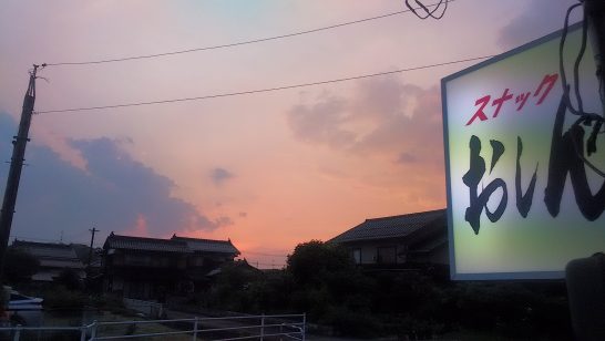 晩酌が済んだタイミングで、悪友からTELあり「おしんです」「OKOK!」てなことで、7時20分よりおしんへ。最初は汚い野郎ばっかり4人ほどだったが、そのうちに別嬪さん?も来て、8人ほどで賑やかになった。交代で歌って9時過ぎに帰宅。 写真下:今夕、おしんへ入る前に振り返ると、雨が止んだ西空は綺麗な夕映えだった。