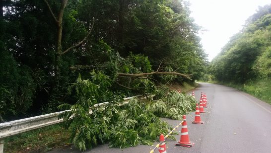 これも昼前の散歩。公園の外周道路を歩いていたら、何やら厳重にガードされていた。近寄ってみると大きな枝が根元から折れて道路側に倒れていた。