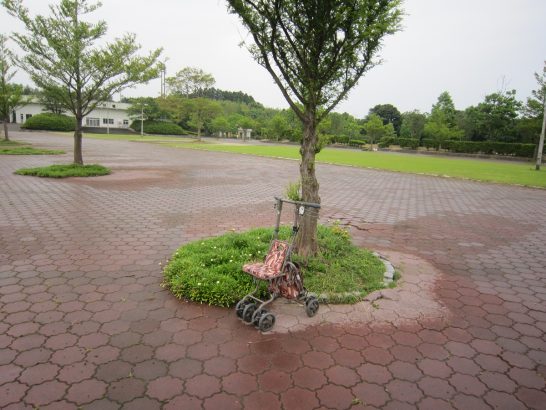 2日前から放置(忘れた?)されている老人車。今日もまだ置いてあった。昨日よりもまた少し木に近づいている。雨に濡れないように、誰かが動かしたのだろう。