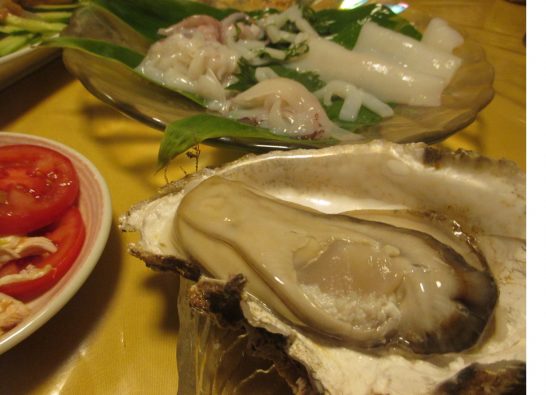 写真上: 本日の料理いろいろ出た中で、全員が歓声を上げた岩牡蠣(夏カキ)。鳥取県産のブランド名は「夏輝(なつき)」。全員が、「お~ナツキちゃ~ん!」。レモン汁をかけてデッカイ実をあっという間に平らげた。他にイカの刺身とかビーフステーキetcがあったが、できればそれよりも、この「夏輝ちゃん」を3~4個、食いたかった。