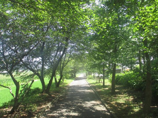 はい、今日の昼前ウォーキングでもこの道を通ってきました。左側は桜、右側はイチョウです。木陰は少しマシですが、出るとメチャ暑でした。