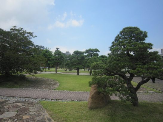 投句を済ませた後はたっぷり時間があったので、県庁前広場の木陰でゆっくり休んで、次の句会の作句などで時間を潰す。 写真①1時間近く休ませていただいた心地良い木陰。 ②松平直政公銅像。 ③その碑文。 ④休憩場所から松江城遠望。左は島根県庁。