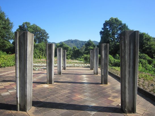 写真 ①中国道上りの加西SA屋外休憩所。②天王寺の花野ビル。塔社事務所は2F。 ③④事務所から徒歩7分にある四天王寺の南門?&五重の塔。昼休みに出かける。
