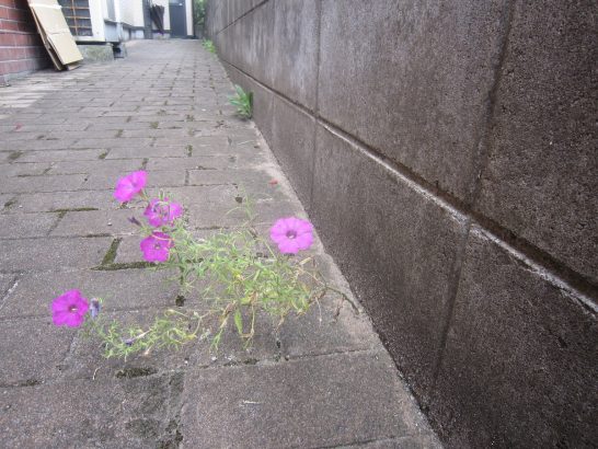 はい、ペチュニア強いです。拙宅から2軒置いた北側の植え込みが毎年花を咲かせているので、そこから種が飛んできたのでしょう。敷石の隙間で少ししか土がないのに、健気なものです。