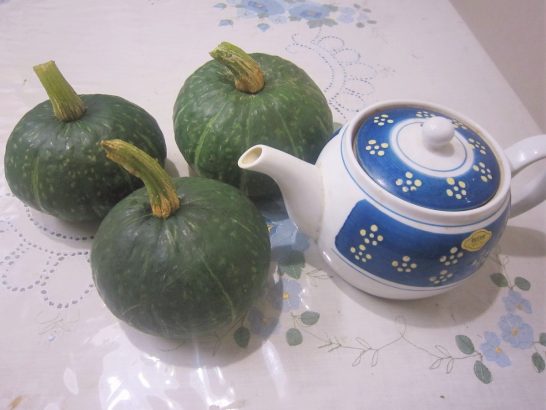 写真①は、先日ご近所から頂戴した小さなカボチャ。大きさ比較で急須を横に置いたが、いちばん小さいのを測ったら直径10センチだった。中学生用のソフトボールが9・5センチなので、ほぼ同じぐらい。これがホコホコして旨かった。このような小っちゃくて旨いカボチャを「こつまなんきん」と言う、のだとばかり思っていたが、本当はチャンとした【勝間南瓜】という種類があって大阪近郊だけで作られているのだという。