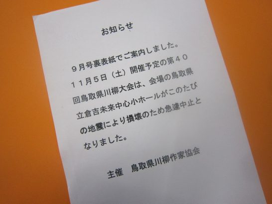 鳥取県大会の中止については、先日お報せ致しましたが、念のためにもう一度アップ致します。写真上①は、川柳塔誌11月号に挟んでいただきましたチラシ。これは川柳塔社編集部が急遽手配してくださったもの。お気遣いありがとうございました。このように11月5日に予定していました大会は中止になりました。出席を予定されていた皆さま、くれぐれもお間違いなきようお願い申し上げます。