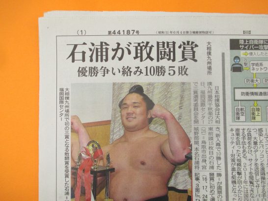 石浦の応援サンキューベリマッチ! まあ、173センチという力士としては小柄な体でよくやりました。これからは上位陣との取り組みが多くなりますので、今場所のようには行かないでしょうが、頑張ってほしいものです。今朝の地元紙(日本海新聞)の1面に写真が載っていましたのでアップしました。