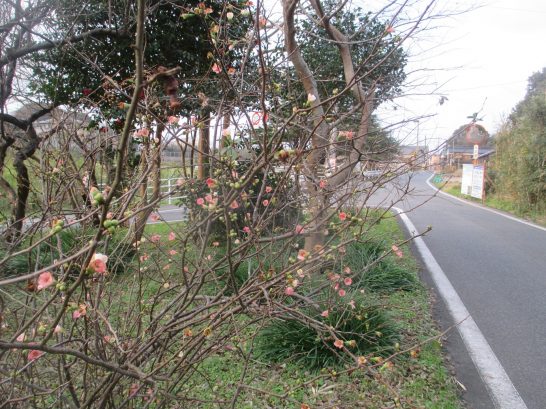 散歩道で見掛けた花は色からすると寒木瓜のような気がします、我が家の寒木瓜は
