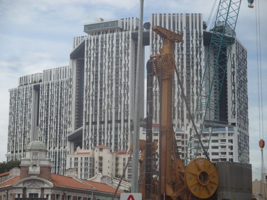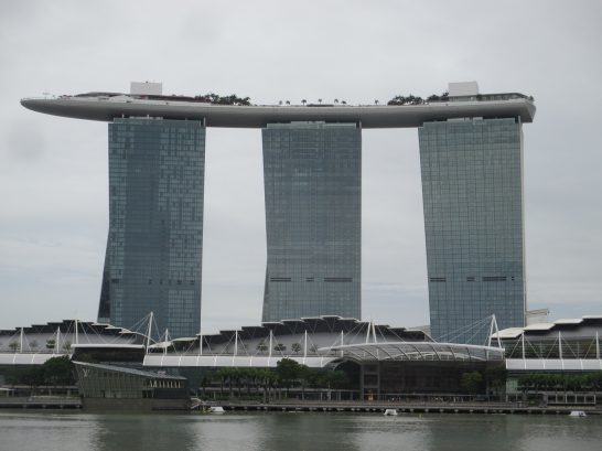写真で見ると歪んでいるようですが、3つのビルは真っ直ぐです。が、それぞれのビルは両の手のひらを合わせたように反っているようです。スマホかパソコンで【マリーナ・ベイサンズ】を検索すると、詳しい形状なども出てきます。ラスベガスの会社が進出した?とか何とか書いていました。