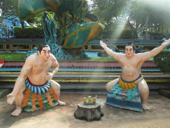現地ガイドが若乃花と誰か?の土俵入りと説明していたが、聞きもらした。二人の真ん中にあるのがタイガーバーム。何のことはない、宣伝に利用されているのだ。
