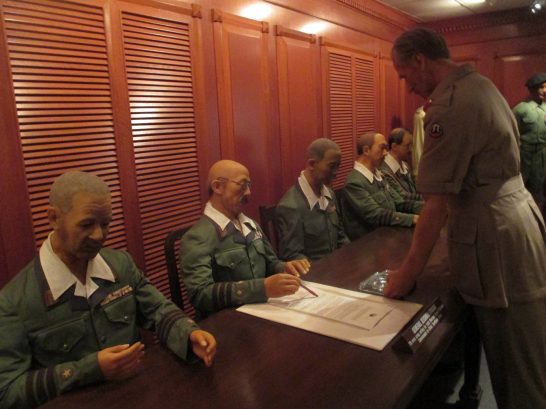 写真下 ①マレー半島に進撃し、シンガポールを陥落させたことで「マレーの虎」と呼ばれた山下奉文(ともゆき)(下の蝋人形、左から2人目)と対面するのは、英国の将軍アーサー・パーシバル。1942年2月15日(私が生まれる9カ月前)のこと。このとき山下奉文、が「イエスかノーか!」と「豪快に降伏を迫った」と伝えられたが、後日、奉文は「私はそのような無礼なことは言っていない」と否定している。