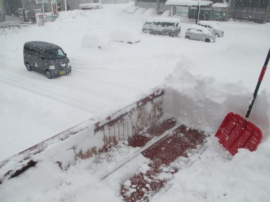 写真上、①②③店の玄関前を除去した状況。②③は夕刻に撮ったもので、ひととき雪が止んで陽が射していた。写真下、④は店の屋根の状況。どれぐらいあったか分かるようにして撮った。⑤は店の屋根から眺めた向かいの駐車場。赤い車を脱出させるためにブルが応援に来てようやく動いた。赤い車の隣の車は雪ダルマのまま。