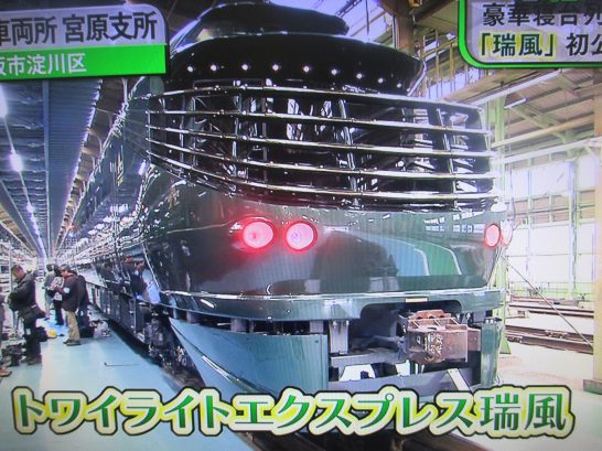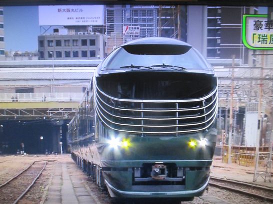 本日の全国ニュース?で「いよいよベールを脱いだ!」と紹介されていたJR西日本の寝台特急「瑞風・みずかぜ」。すごい人気で、運航初日の6月17日から11月までの予約は完売とのこと。いちばんの人気で抽選倍率が68倍?だったのは1人120万円。カップルでは240万円。僅か2泊3日の西日本1周の旅。いかに超一流の料理が出るといっても、チョイと高すぎるのではないか?と思うのだが…。これが凄い倍率で完売! 金の遣い道に困っている人がいかに多いか、ということだろう。全国のリッチな皆さ~ん、瑞風で山陰へお越しくださ~い! 写真上:いずれも本日のTVニュースより。