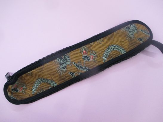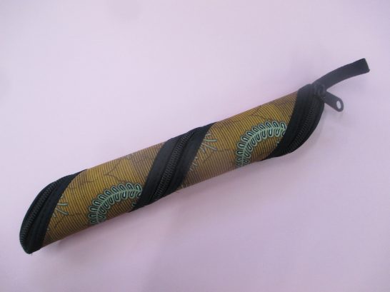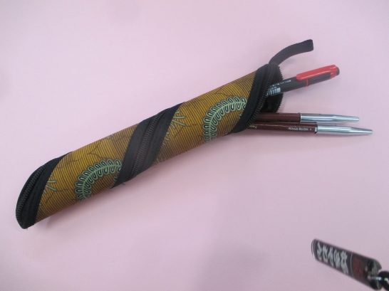 写真上: 毛虫のようなブツは、先日の旅行で買った私自身へのお土産。今日、毛糸を買いに来られた顔見知りのご婦人に「これ何でしょう?」と見せたら「ペンケース?」と、あっさり正解。その通り、どう見てもペンケースだが、これの面白いのは、1本のファスナーで筒状に形作っていること。ファスナーを全開にすると下の写真のようになる。しっかりした筒状を維持するために、布地の裏に薄いゴムをくっつけているのがミソ。