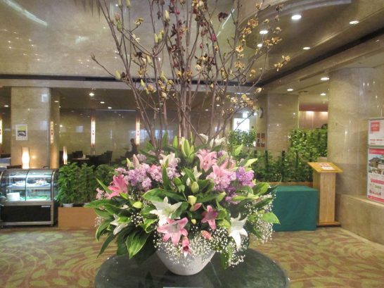生け花、キレイなので「造花か?」と近付いたらいい匂いがしていましたので本物だったようです。真ん中で突っ立ているのは木蓮ですが、これは萎びたような感じでした。