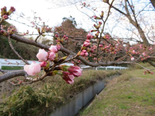 写真①、会場の「さざんか会館」5Fテラスから見た駐車場。マイカーは角にある四角いボックスの右側。正面の鉄塔はNTT。  写真②、帰宅してからの散歩。ジャスト6時の野球場の夕焼け。  写真③、同時刻。総合公園にある「私の桜」の蕾。今にもほころびそう。「鳥取の開花宣言」は今夜のニュースでやっていたが、この散歩道の開花は明日だろう。(私の桜以外では、2~3輪咲いていたのがあった)