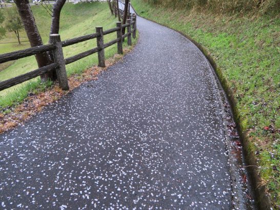 連続の句会や大会への出席準備など何やかやで、到着していた【卑弥呼の里誌上大会】発表誌をゆっくり読めず、本日改めて拝読。参加者590名の盛会は、選者の顔ぶれもさることながら、主催の真島久美子さんが各地の大会に精力的に出席してチラシ配布&PRされた賜物だろう。私は去年全没だったが、今回は2句入っていた。                             写真①総合公園の「私の桜」、小雨に濡れて満開。②散り始めた桜。③はなびらの道。