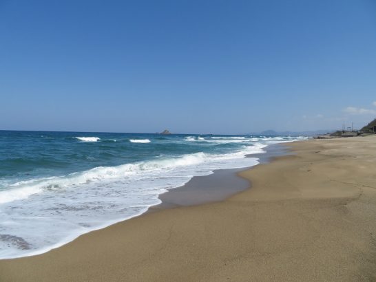本日、第2木曜日にて「岩美川柳会」例会日。早い目に出て白兎海岸で昼食と定点観測。いつもは陸橋の上からの撮影だが、今日は快晴で時間もあったので波打ち際まで降りてパチリ。写真①は海岸の東側。②は西側。波はまだ冬の名残りでいささか荒かった。