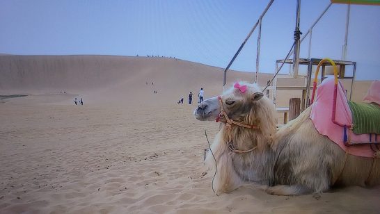 ウワーオー❗駱駝さんリボンもつけて可愛いですね、、去る四月の鳥取砂丘へ行った時のことを思い出します、、「何か駱駝に乗りたいだと⁉止めておけ駱駝がかわいそう、、お前が乗ったから、、砂地に駱駝の足がのめり込み前には進まんじゃろうが、、」なんてね❗のたまう男もおりまして、、こうなれば「絶体乗ってやる」と、思ったのですが実際駱駝さんと砂丘を目の前にしたら、流石の私も乗れなかったトホホ、、だったのですよ。老いては素直さが一番だねと感じ入りました。