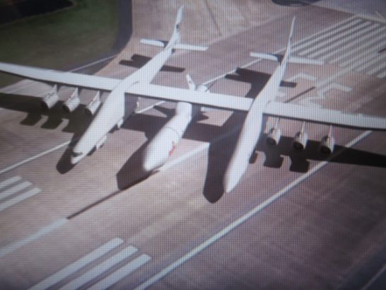 写真上:午後5時40分の総合公園。細かい雨で薄暗く外気温も20℃まで下がっていた。 写真下:ロケットを空中で発射させるために開発された史上最大の航空機。マイクロソフト共同創業者のポール・アレンが開発に関わった?と先日のニュースで言っていた。 写真①は、そのTVニュースを写したもの。②は、先ほどネットで検索して撮ったもの。ロケットを装着した状態を示している。航空機から発射すると最初から高度とスピードがあるので、地上発射と比較するとコストダウン出来るのだという。大統領選以後、ゴタゴタしているが、このような航空機産業&宇宙産業はやっぱりアメリカがナンバーワン。