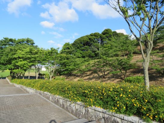 写真上: 本日午後5時過ぎの総合公園エントランスに植えられいる金糸梅。満開直前の時期で黄色が眩しいほどだった。