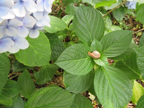 カタツムリ、あのままでは踏まれるか轢き潰されるところ。アジサイの葉っぱに乗せてやったら「ありがとうございました…」と喜んでいました。「カタツムリの恩返し」を期待しています。