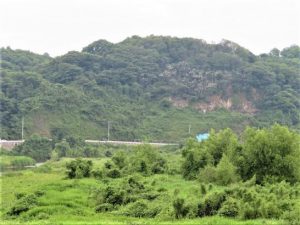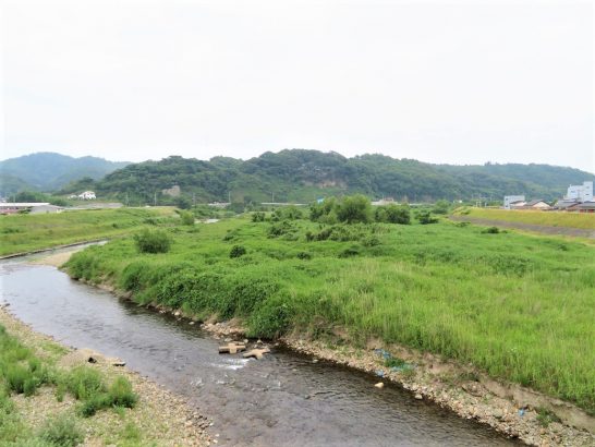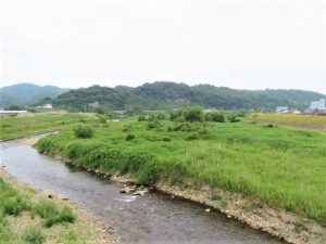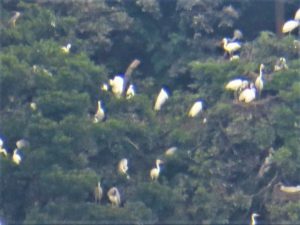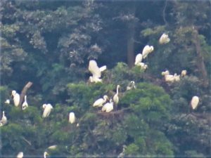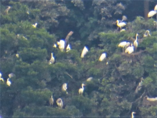 写真下①、倉吉句会場近くの1級河川「小鴨川・おがもがわ」。②、正面の山の中腹に白い点々がいっぱい。③④、ズームアップすると大きな白い鳥だった。鷺だろうか?