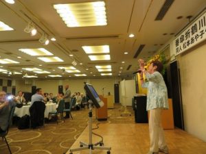 終了後、別室にて懇親会。参加者85?名ほど。ビールで乾杯後は焼酎の湯割りガンガン! ビールを注ぎに来て下さったらビール。清酒は飲まず2種混合。カラオケは最初に「宗右衛門町ブルース」と、10人ほどと一緒に「六甲おろし」。   写真①、今秋の全国大会「奈良」をPRの奈良の皆さん。②、森中恵美子先生の熱唱「雪椿」。 愉快に飲んで食って騒いでバイバイ。