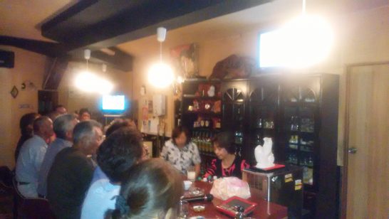 午後6時過ぎ出発→上郷地区の「町議会意見交換会」(写真上)。あまり関心はないのだが四馬鹿大将の1人が町会議員なので応援気分で。出席は三馬鹿と一緒の車で。7時開始で9時前終了。のち3人でおしんへ。花金のおしん、常連さん勢揃いで満席(写真下)。私たちが入ってから20分後に5人グループが来て断られていた。予備の椅子があるので、2人ぐらいなら詰めたら座れるが、5人はちょっと無理。珍しいことだった。