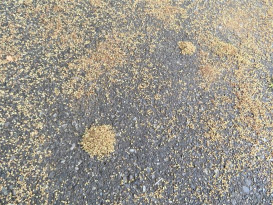 お盆に帰省していた東京の義妹が明日帰るというので、町内の義姉も来て宴会。よく喋る3姉妹を相手に飲むのは大変だが、私はもっぱら聞き役。この3姉妹、酔っぱらった目で観察して分かった共通DNAは「言いたいことは遠慮せず言う」ということ。まあ姉妹だから当然ではあろうが…。私の役目は「相手が喋っているときにかぶせて喋らないこと!」「相手の言い分をよく聞いてから反論すること!」etc。私が激論?を遮って、そのように言うたびにみんな大笑い。ともあれ、1時間30分。愉快に飲み過ぎたところでバイバイ! 先ほど、自室に引き上げたところ。                 (写真上:数日前の総合公園の遊歩道にて。道路上に何やら丸い塚のようなものがあちこちに出来ている。屈んで仔細に観察すると、蟻が小さな葉っぱか実?のようなものをセッセと集めている。しかし下はアスファルト。雨が降ったら流れてしまうのだが…。何のための塚なのだろう? 同じようなのが付近に7~8個も出来ていた)
