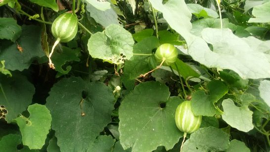 写真の カラスウリ 青い状態は初めて見ました。もっともいつも見ている訳じゃないので、赤くなって気付くということ、ですね。