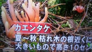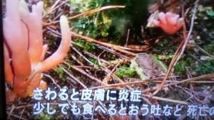 写真②③は、今夕のローカルニュースを観ていたら、「琴浦町の大山山麓にも…」と言っていたので、慌ててTV画面をパチリ。この毒々しい色をしたキノコは【カエンタケ】というらしい。極めて毒性が強く、少し触っただけで炎症を起こし、食べると死ぬこともあるとのこと。まあ、見慣れない茸は食べないこと。茸に対して好奇心は禁物。