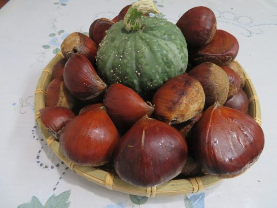 今年の夏も、友人や知人から、茄子・胡瓜・ピーマン・玉葱・ジャガイモetc、たくさんいただいた。そして、昨日今日と写真のでっかい栗と可愛い南瓜を頂戴。この栗の商品名は【ぽろたん】。品種改良で「渋皮がポロリと剥ける」ようになった画期的なもの。友人のFさんが400本ほど栽培されていて、表皮に少し傷がついたのをたくさん持ってきてくださった。この栗については【ぽろたん】で検索していただくと詳しい情報が出てきます。可愛らしい南瓜は別の知人が大きな南瓜とピーマンと一緒に持ってきてくださった。品種は【勝間南瓜】(こつまなんきん)ではないと思うが、ホコホコしてなかなか美味。以上は写真①。