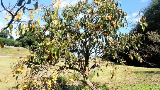 写真上: 数日前の総合公園にて。昼前散歩で通りがかったら柿が鈴生り。その内の1個、赤く熟れたのを何気なく触ったら、グニュっと柔らかかったので、何気なく引っ張ったら「どうぞお召し上がりください」と言うようにポロリ。(では遠慮なく…)と、歩きながら頂戴したら、メチャ旨かった!