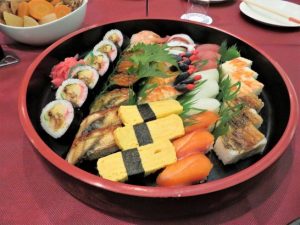 写真①、12日朝、中国道にて見事な朝焼け。②、(一社)全日本川柳協会理事長・小島蘭幸氏の開会挨拶。③、前列の椅子席が受賞された皆さん。向かって右端が木本朱夏さん、その左が伊達郁夫さん。伊藤寿美さんの受賞句は「投句の部」で大会は欠席だった。④、交流会で一番先に売れた寿司。誰も手を出さない前にパチリ。