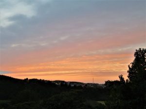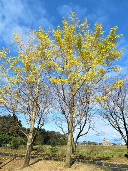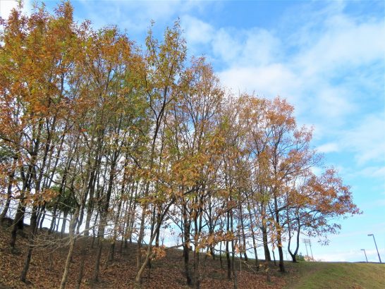 写真①、総合公園駐車場の公孫樹。半分ほど葉っぱが散っている。②、公園内の雑木林。③、公園内の遊歩道。④、夕刻散歩にて。公園外周の農道から見た夕焼け。やはり少し雲がないと夕焼けも面白味がない。