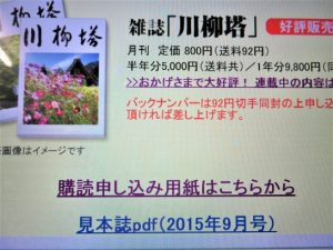 なお、川柳塔誌購読申し込み用紙も、サイトトップ下方の写真の部分をクリックしていただきますと印刷できます。また、見本誌(1060号)もご覧いただけます。
