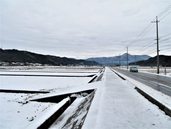 本日、午前11時25分「浦安」発のJRにて→12時13分「浜村」着。雪も降らず風もなく、散歩に最適なので会場に向かって歩く。20分ほど歩いていたら、歩道の雪が残ったままになってきた(写真上・正面右の山は鷲峯山)。車道の雪は蹴散らされて溶けているので、車道を歩こうかと思ったが、飛ばしている車も多くてちょっとヤバい。革靴では歩き難いな、と思っているところへ、会場へ向かう照彦さんの車が通り掛ったので乗せていただく。照彦さん有り難うございました。