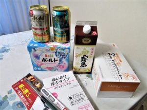 句会終了後、新年会。句会のテーブル席に鍋をセットして寄せ鍋。椅子席のままなのでラクチン。籤引きで賞品いろいろゲット。 写真下:洗剤は「天」賞。昨年度の入選句で「天」が多かったのでゲット。白霧島は私が飲み残したものを頂戴。鹿野の皆さまお世話になりました。おかげさまで愉快なひとときでした。帰路は同じ方向に帰る石花菜さんの車に乗せて貰ってラクチン。石花菜さん有り難うございました。本日歩数5154。