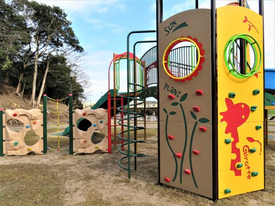 写真:昼前散歩、総合公園に新しく出来た「こども公園」の遊具。壁にくっついている緑や赤の取っ手は、いま流行りの「ボルダリング」の「ホールド」。子どもの遊具にまで現れたとは、まさに時代の流れ。本日、7153歩。