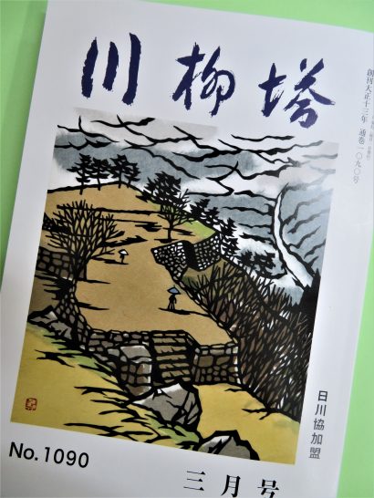 写真:川柳塔3月号(1090号)の表紙。過日、富山大会の帰りに皆さんと訪れた竹田城! 切り絵は、ずっとお世話になっている前田尋先生。