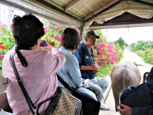 昼食後、石垣港(高速艇?にて約15分) → 竹富港 → 竹富島観光。写真下:ブーゲンビリアの道を牛車に揺られて。監視塔。古民家の民宿。星の砂を捜す。私はいいかげんに探していたので見つけられなかったが、たくさん見つけていた人も多かった。