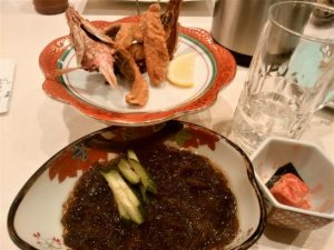 午後4:45分竹富港発 → 17時・石垣港着 → ホテル・チェックイン。 → 午後6時40分よりホテル隣接のレストランにて夕食(ライブショーつき)。料理はあらかじめ個人々が注文したもの。私は酒の肴に「グルクンの唐揚げ」と「とうふよう」と「モズク」を注文していたが、出てきたモズクを見てビックリ! お茶碗に1杯以上ある(写真)。隣席の仲間に御裾分けしてようやく食べ終えた。モズクの右は「とうふよう」。男性諸兄は生ビールでカンパイだったが、私だけ泡盛30℃をボトルで注文してお湯割り。もちろん、このボトルは皆さんで飲んで、きれいに空っぽ。今夜もマイルームで「居酒屋」開業出来ず。昨日の歩数を忘れていたが7800歩ほどだった。本日は9094歩。