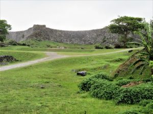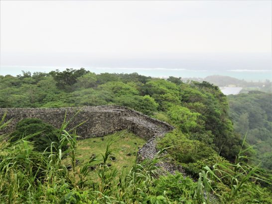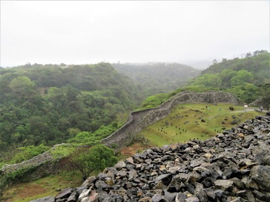 写真上、いずれも今帰仁(なきじん)城跡にて。万里の長城を思わすようななだらかな石積みの城壁が印象的だった。細かい雨が降るあいにくの空模様だったが、かえってそれが幻想的なムードを出していた。旅行中に傘が必要だったのは此処だけ。