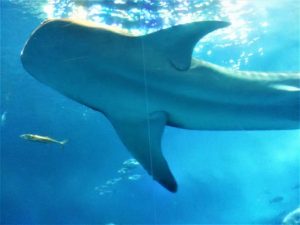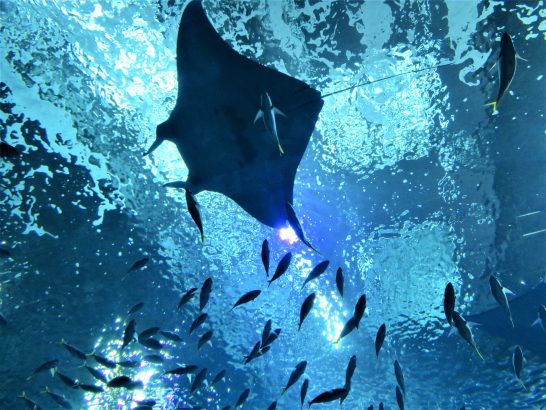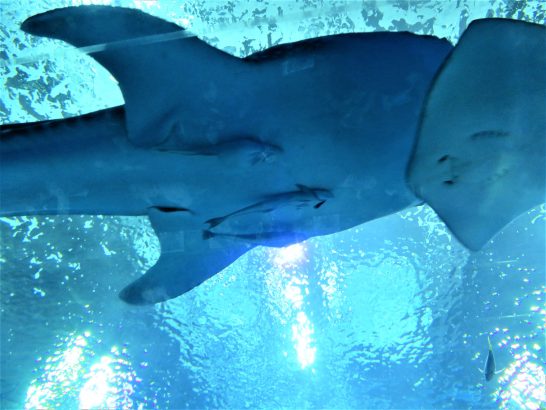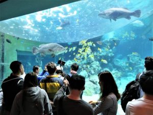 エントランスから水族館へ向かう遊歩道の脇に、可愛いモニュメントがたくさんあって、子供連れの若夫婦や若者たちが、はしゃぎながら記念撮影などをしていた。外国勢の中では韓国人が多かった。「スミマセン、シャシン、トッテクレマセンカ?」と遠慮がちにスマホを差し出した若者も韓国人。どういう訳か1人だった。