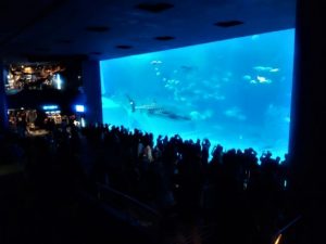 写真下:沖縄海洋博のときに作った大規模な水族館。沖縄観光の目玉の1つになっているのだろう、大型観光バスが次々に到着して大賑わい。どの水槽の前も魚より人間のほうが多いぐらい。やはり外国人と日本人と半数ずつの印象。